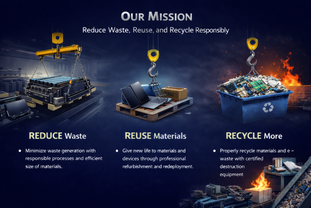 We recycle a wide range of materials, including electronics (e-waste), EV and energy storage batteries, metals, plastics, paper, and industrial components, following certified and environmentally responsible processes.